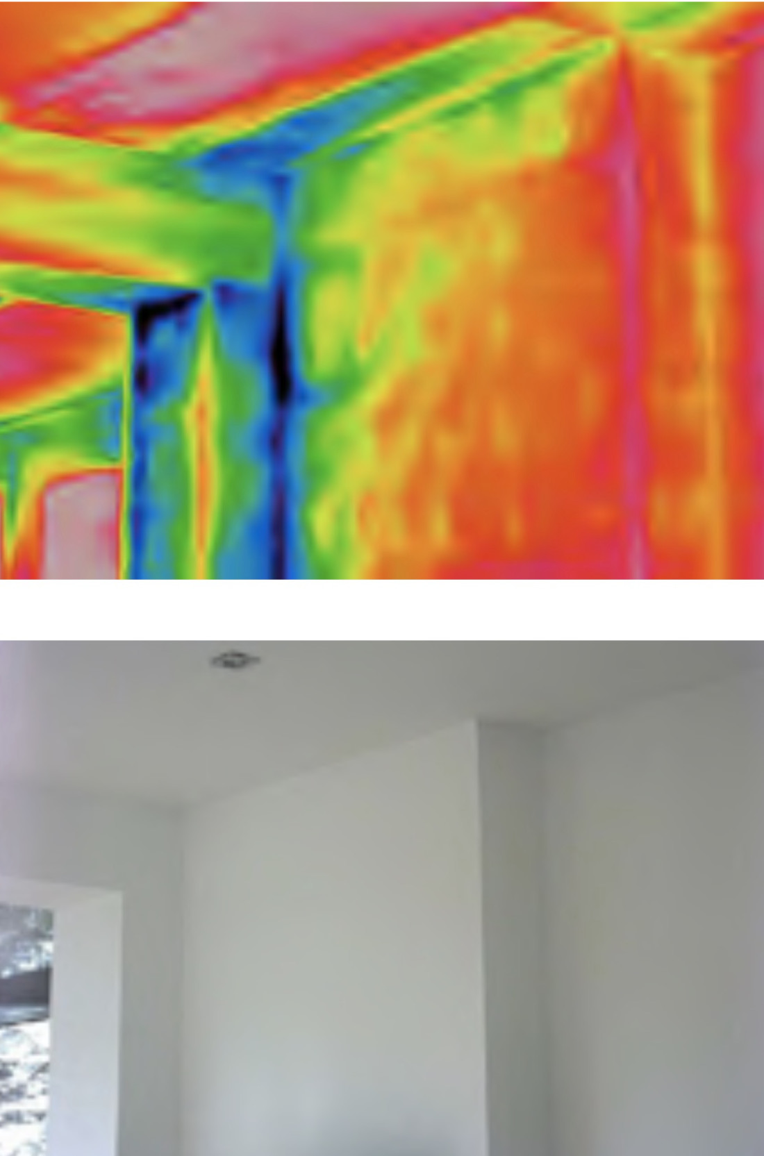 Corners form their own thermal bridge, often colder than adjacent wall areas. The mould here is also probably related to being normally behind a sofa with little air movement. The image in the top corner is a thermal or thermographic image (infrared), which shows the surface temperatures of the surroundings. There are several examples of thermal images in this document.