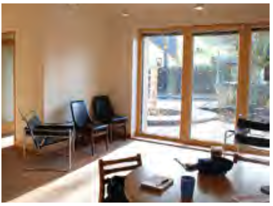 When air moves, it cools the human body, even if the air is warm, so draughts are not just an energy problem but also a comfort problem. Downdraughts from cold surfaces, like large glazed areas, can cause discomfort, but in this Passivhaus, the large windows are draught-sealed and triple-glazed, meaning there is no downdraught, and it is possible to sit close to the window and appreciate the garden in complete comfort.